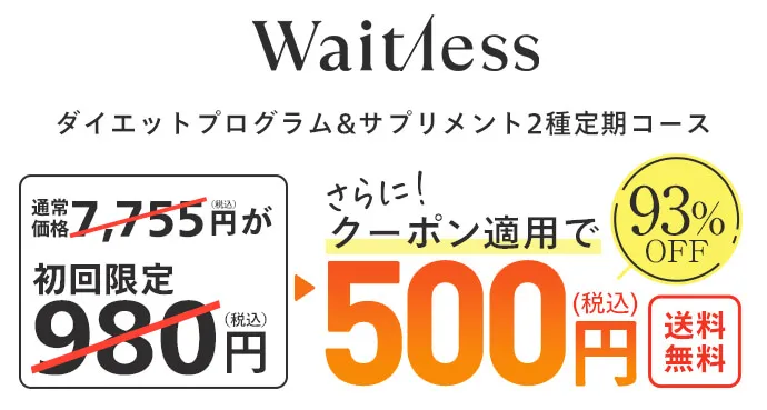 ※Waitlessプログラムの臨床試験者の数値を統計処理した結果、3ヶ月間で体重:59.18±4.67kgから53.94±4.15kg。確率的に可能な数値変化の幅は、-4.56kg~-5.92kg(95%信頼区間による。実績値、2021年7月TFCラボ調べ)※個人に合わせて適切な食事/運動プログラムを実施している為、結果には個人差があり、効果を保証するものではありません。