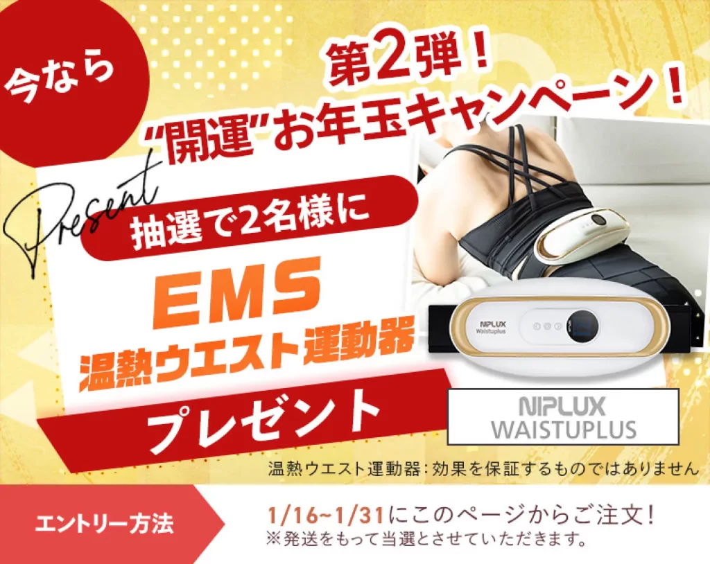 今、数量限定で正月のキャンペーンを開催しているみたいで、専用ボディケアマシーンを抽選でプレゼントしてもらえるチャンスだそう!