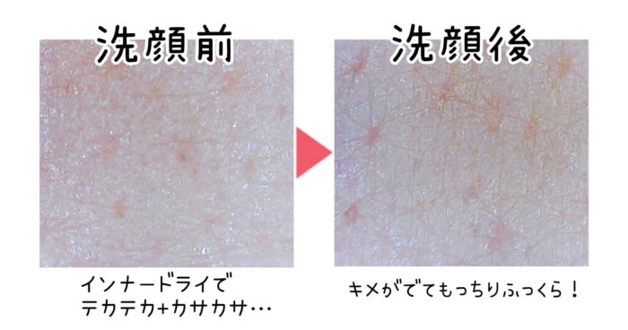実際に洗顔前後の肌を見てみたんですが、洗顔後のほうが肌のきめが整ってる…(笑)