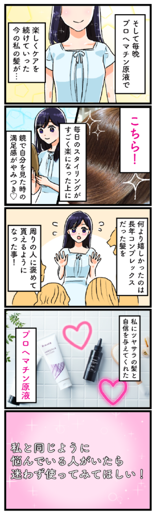 「すごい!サラサラ!私も使ってみようかなプロヘマチン原液!」