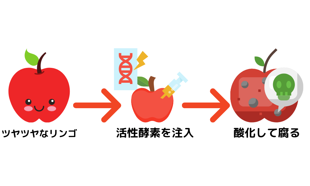 リンゴを人に見立てて行われた臨床実験では、大量の活性酵素を注入したところ抗酸化力が弱まり酸化して腐るという結果に…