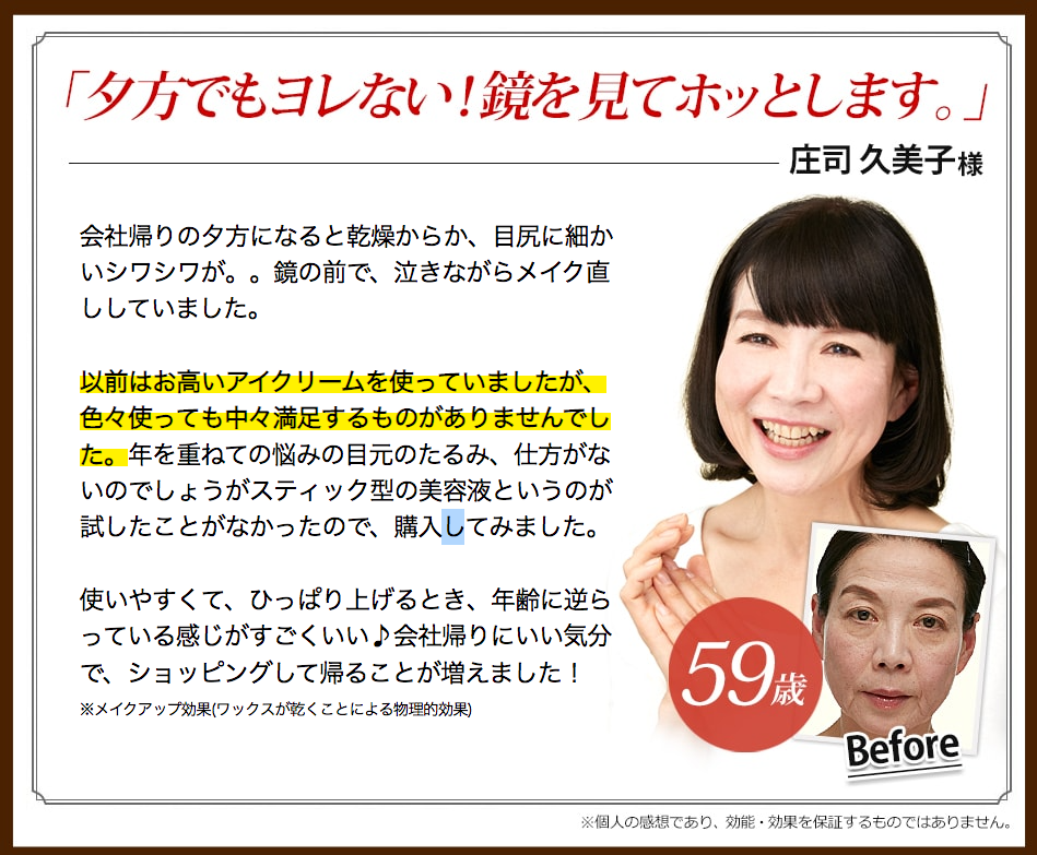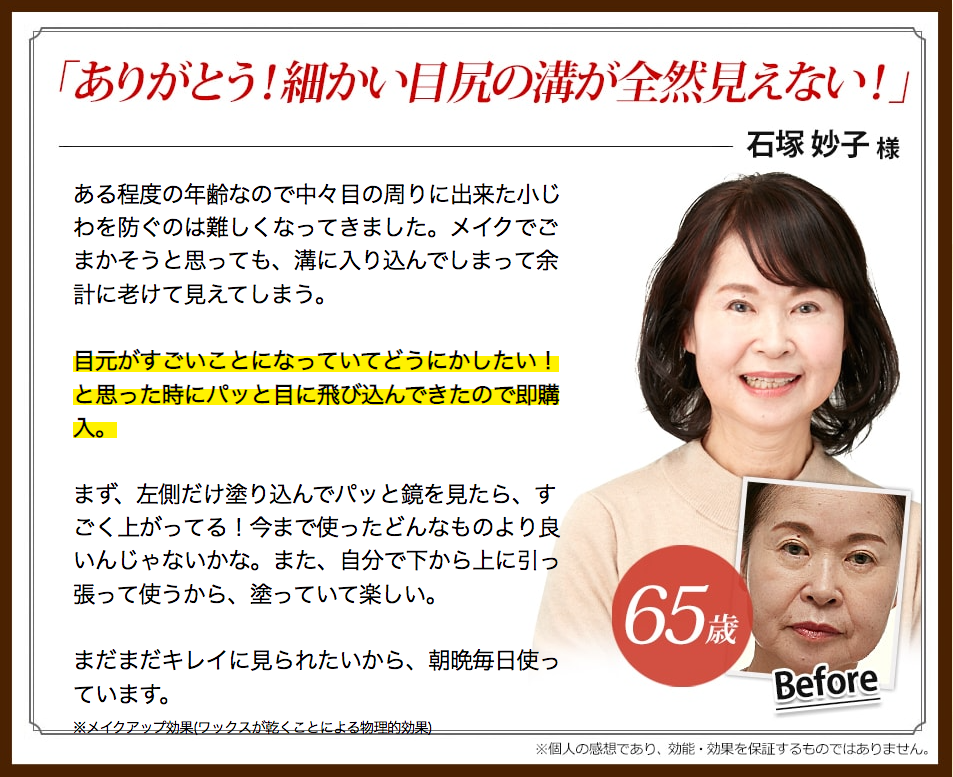 「目元の気になるところが、60秒でピーンとなるのよ!」※