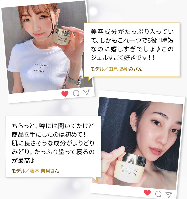 50歳を超えてもスッピンで褒められることが多くなりました。モデルの道を諦めた時もありましたが、ビューティーオープナー ジェルにおかげで自分に自信が持てています!