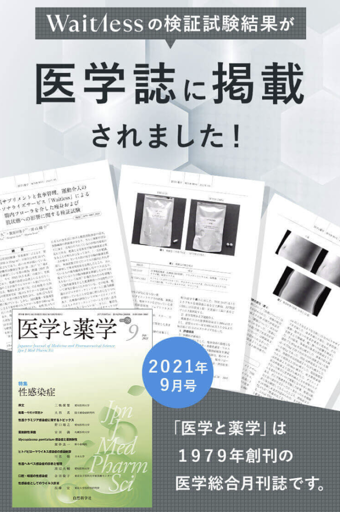 ※上記、臨床試験は運動と食事を併用してWaitlessを摂取した結果です。Waitlessプログラムの臨床試験者の数値を統計処理した結果、3ヶ月間で体重:59.18±4.67kgから53.94±4.15kg。確率的に可能な数値変化の幅は、-4.56kg~-5.92kg(95%信頼区間による。実績値、2021年7月TFCラボ調べ)※個人に合わせて適切な食事/運動プログラムを実施している為、結果には個人差があり、効果を保証するものではありません。