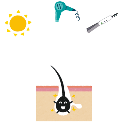 髪の毛は、爪などと一緒で一度は死んでいる細胞なのでドライヤーやヘアアイロンの熱、カラー剤などの薬剤や紫外線などのダメージを受けると