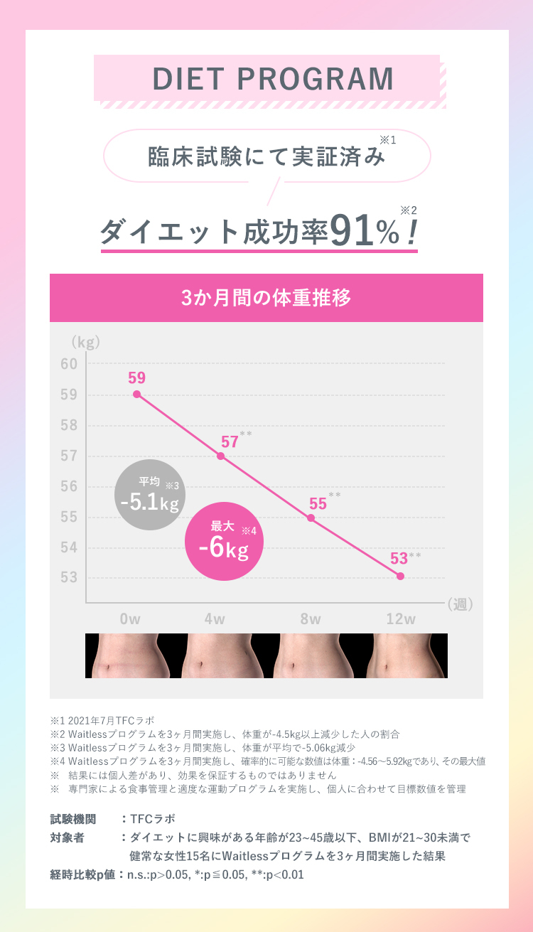 ※Waitlessプログラムの臨床試験者の数値を統計処理した結果、3ヶ月間で体重:59.18±4.67kgから53.94±4.15kg。確率的に可能な数値変化の幅は、-4.56kg~-5.92kg(95%信頼区間による。実績値、2021年7月TFCラボ調べ)