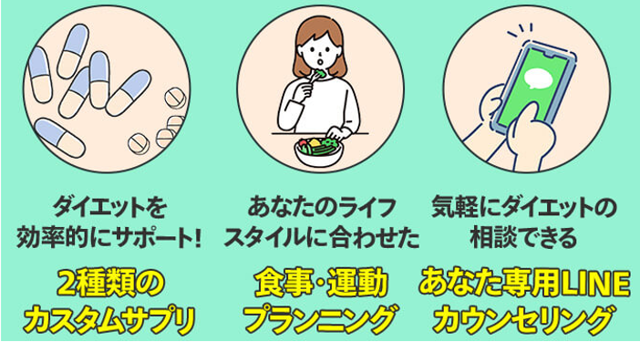 オンラインで診断をして、その診断結果を元に9万通りから自分にピッタリの生活や体質に合うダイエットプログラムを作成し食事や運動方法・専用サプリを作ってくれます☺️